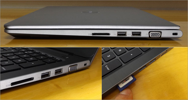 Vostro 14(5468)の右側面では「SDカードスロット、USB2.0端子、USB3.0端子、VGA端子、セキュリティロック・スロット」を配置している。挿入したSDカードはやや突き出し気味になる。