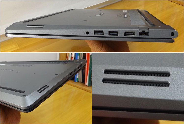 ヒンジの内側に排気口が配置されている。理想的なエアーフローとは言い難いが、低発熱のUシリーズで内蔵グラフィック仕様であれば、気に病むことではないだろう。NVIDIA GeForce 940MX を搭載して、24時間ゲームを動作するなら懸念要素であるが、常識的な用途であれば問題ないと思われる。