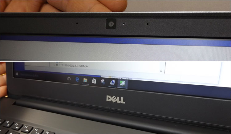 ディスプレイベゼルには、Webカメラとデュアルマイク内蔵。DELLロゴはシルバーのプリント。
