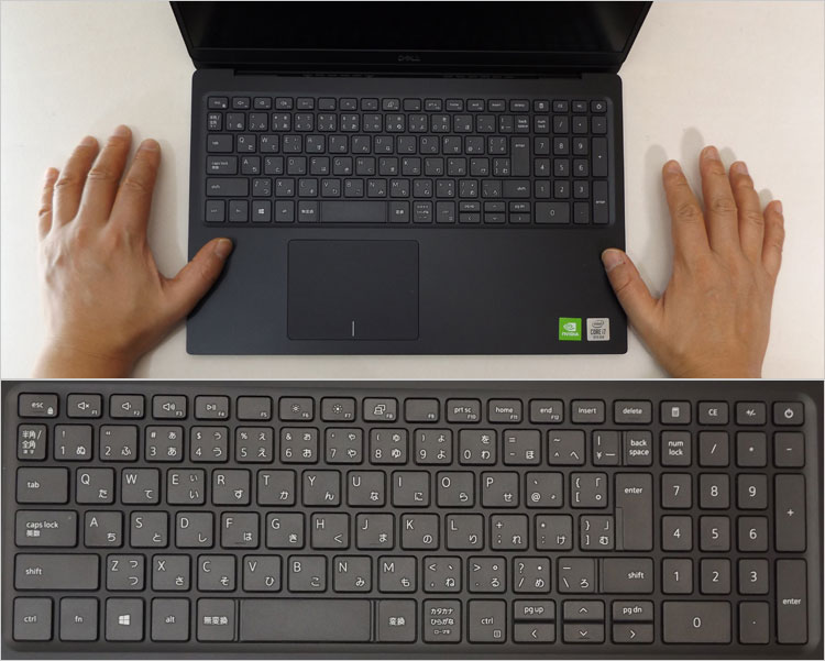 BackSpaceと¥、半角全角キーが小さいのでやや扱いづらい。カーソルキーでは段差や空間がなく、他のキーと整列されているため、やや扱いにくい。15.6インチノートという幅の制限があるため、テンキーはやや窮屈。