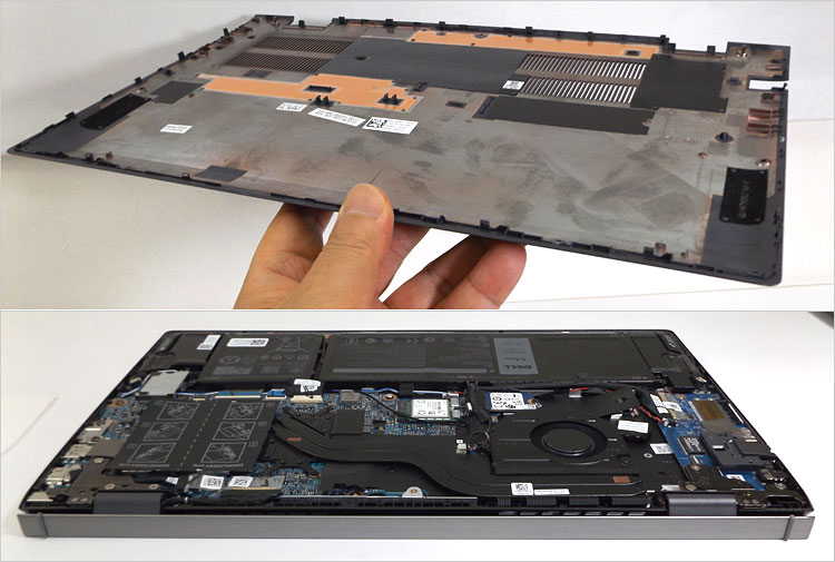 DELLサイトにて分解マニュアルがダウンロードできるので、分解手順を知ることができる。ただし自己責任の作業であるため、当サイトでは推奨していない。リスクを理解されていることを前提に紹介している。ネジを外し底面カバー全体を外す工程になるが、肝となる作業は多数に引っ掛けてあるツメを丁寧に外していくことである。無理に力を加えるとツメの破損につながるため、パテ用のプラスチックヘラが必需品となる。いくつか幅の異なるヘラを取り揃えるとよい。