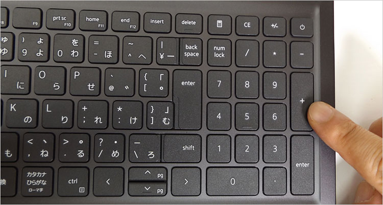 ホームポジションの様子。テンキー付きなので、やや左寄りになる。この実機ではバックライト機能は無し。