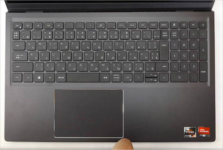 アルミ合金のパームレストでわりと高級感を出している。一体型のタッチパッドは広め。テンキー付きのキーボードを搭載しており、手元のVostro 5515実機では非バックライト・キーボード仕様。オプションでバックライト機能付きも選べる。DELLサイトでは所々に「カーボン」と記載されているが、これはカーボンファイバーではなく「カーボンみたいな黒色」を指している。まったく紛らわしい。