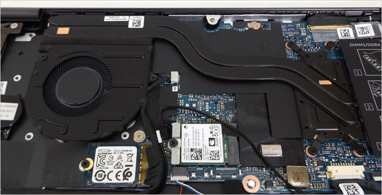 CPUファンの下辺りに、NVMe SSDのM.2スロットと無線LANカードのスロットがある。