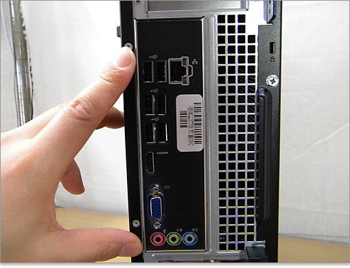 DELL Vostro 260sの背面を詳しく見ていきます。正方形の穴が無数に空いたメッシュ状の背面です。背面側には排気用のPCケースファンがなく、前面の吸気ファンによって取り込まれた空気を、そのまま背面に素通りさせるエアーフローとなっています。なお、Vostro 260s内部は後ほど紹介します。