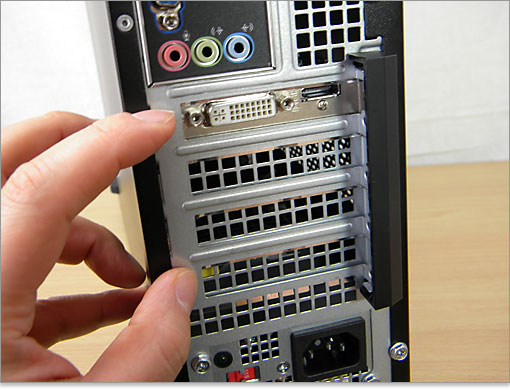 納得パソコン購入術!パソ兄さんにて、DELL Vostro 260sをレポート中。このページでは背面にあるインターフェース(端子)にスポットを当てて詳しく紹介。背面は通気性を考慮した荒いメッシュ状のデザインで、排気ファンは搭載されていません。ロープロファイルの拡張スロットを装備。