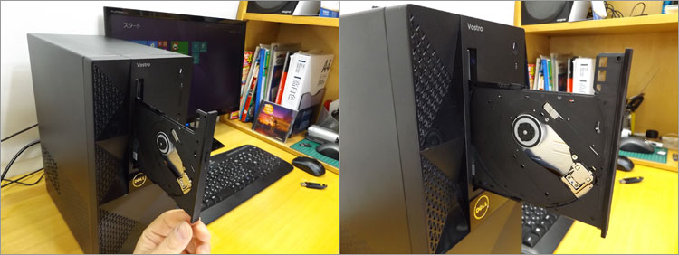 ノートパソコンで使われるスリム型光学ドライブを搭載しており、縦位置に配置している。従来のようにデスクトップ用(5.25インチドライブ)を採用しないことで、さらにコンパクトなミニタワーデザインとなっている。ただし、スリム型なのでディスク読み込み速度はノート同様に遅めになる。また、トレイをみるとディスクの落下防止ツメがあり、トレイ自体はデスクトップ用に作られているようだ。