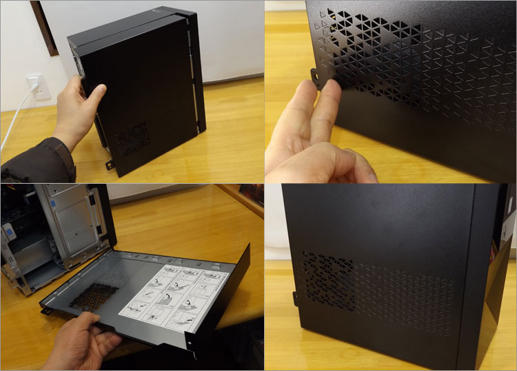 開閉できる左側面パネルでは、拡張スロットの位置に吸気口を配置している。吸気口は三角系のデザインチックな形状で開けられている。