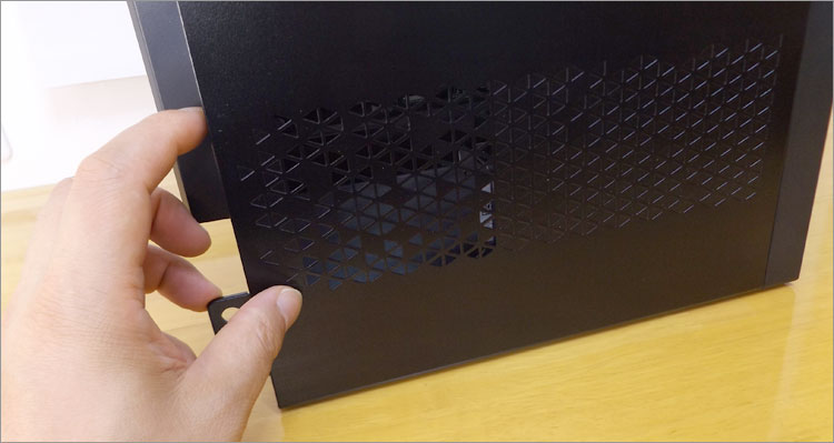 右側面には、通気口もなし。正規ではないが横置きにするなら、この面に耐震マットでも張り付けて対応できそうだ。