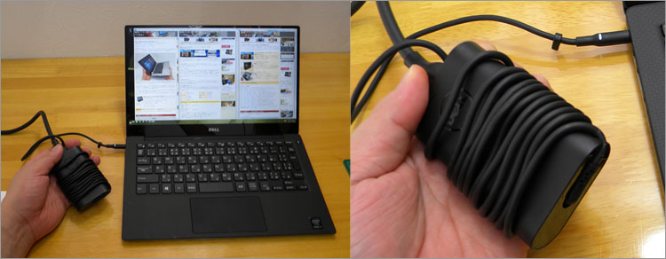 DELL電源コンパニオンからパソコンとへつなぐケーブルが2本付属しており、XPS 13(9343)以外にもいくつか対応するDELLノートがある。コネクタの太さが2通りあるので、対応製品に合うケーブルを使う。