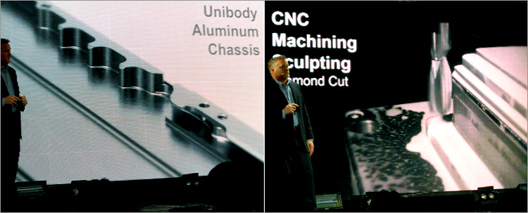 CNC加工の様子。金型による成形ではなく、アルミのインゴット(塊)からCNC機械加工によって削り出している。