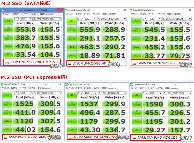 以下、過去にレビューしたPCに搭載されていたSSD比較してみよう。