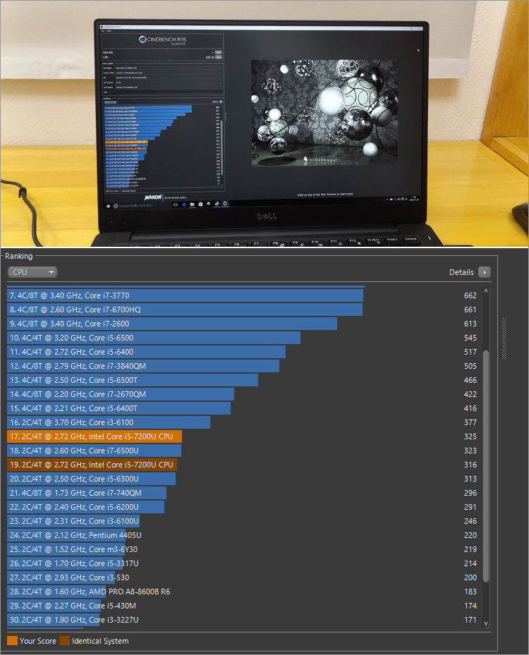 CINEBENCH R15のレンダリングでは、325。Core i7-6500Uに近いパフォーマンスのようだ。ワットパフォーマンス(少ない電力でも効率のよい処理能力)がいいが、スコアで比較すると、昔の通常版CPUに劣ることがある。
