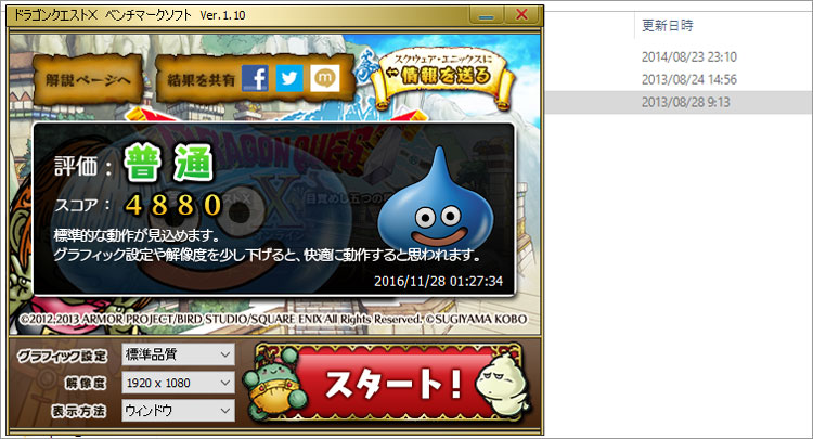 ドラゴンクエストX をフルHD(1920 × 1080)でチェックしたベンチマークテスト結果。 当方がレビューした「Core i5-7200U &インテル HD グラフィックス620」のPCとしてはかなりの好成績。バックグランドの状況で左右されたのだろうか・・。