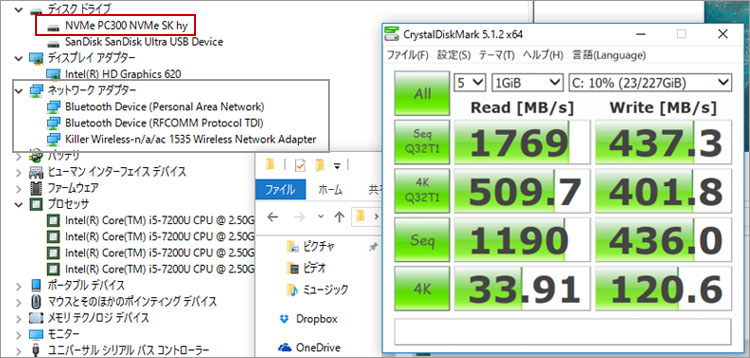 レビューしているXPS 13-9360実機では、256GB SSDを搭載しているが、高速のPCI Express 接続となっている。モデルは、SKハイニックスのNVMe PC300。シーケンスリードでは4桁になっている。