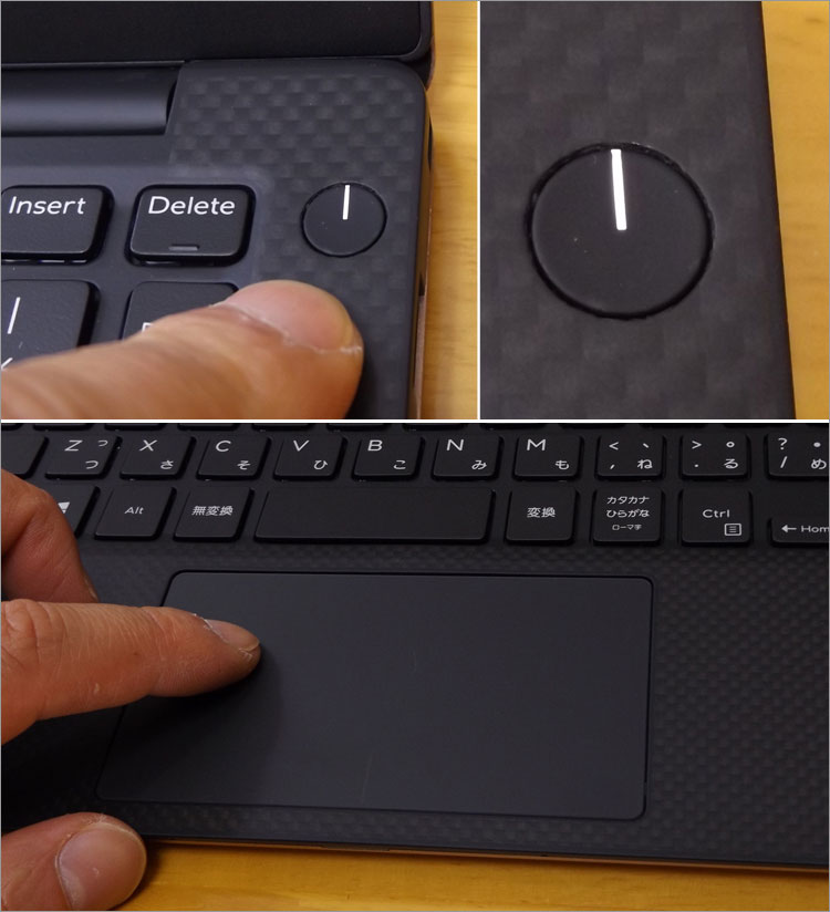 XPS 13の電源ボタン電源ボタンの様子。起動中は棒状のLEDライトが点灯する。 タッチパッドは一体型。