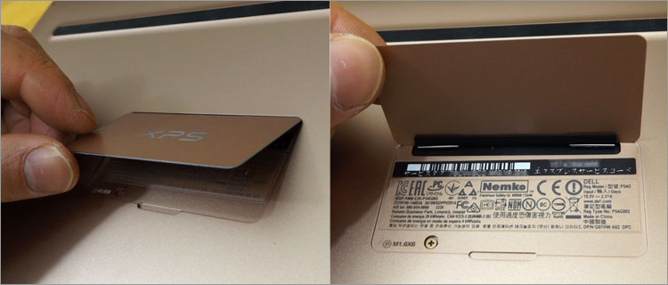 中央にはエッチングされたXPSロゴがあり、プレートを開けると仕様や保証に必要なサービスタグなどが記載されている。これはデザイン性を損なわないための目隠し。