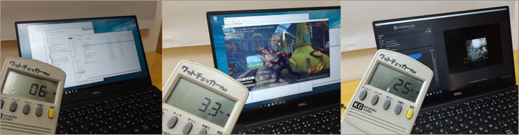 満充電、ディスプレイ輝度最大時で、消費電力をチェック。アイドル時では6W程度。ストリートファイター4ベンチマークテスト中では33Wあたり、CINEBENCH R15レンダリング中では25Wあたりだった。