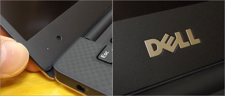 狭額ベゼルのため、Webカメラは上部中央に内蔵できず、左下に内蔵されている。下部中央にDELLロゴを配置。