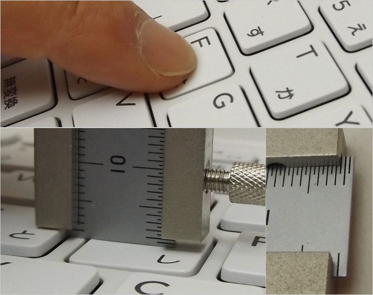 公称1.3mmのキーストロークがあり、最近の13.3インチモバイルとしてはしっかりした押下がある。実際測ってみたところ1.5mmかと思ったが写真で見て分かる通り少し浮いていた。そのため、公称どおり1.3mmで間違いなさそうだ。キーストロークが1mmのモバイルでは「浅いけどモバイルではこんなものか」という印象だが、1.3mmあるとかなり手応えは変わってくる。