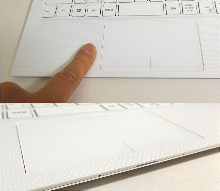 ガラス製の高精度一体型タッチパッド。スペースもそこそこ広い。ガラスの裏側に白く塗装しているよう(または白い下地を置いている?)で、表面ではガラスの透明感が出ている。指でなぞるとシルキーのようにスゥーとした心地よいすべり。ただクリックの反応エリアが広く、広範囲でガタガタする。(クリック入力が反応するわけではない)。カチカチとクリック音はそこそこあるが、固さ的にはちょうどいいと思われる。