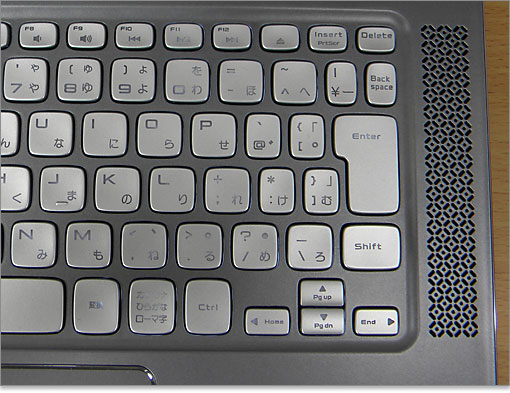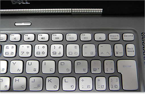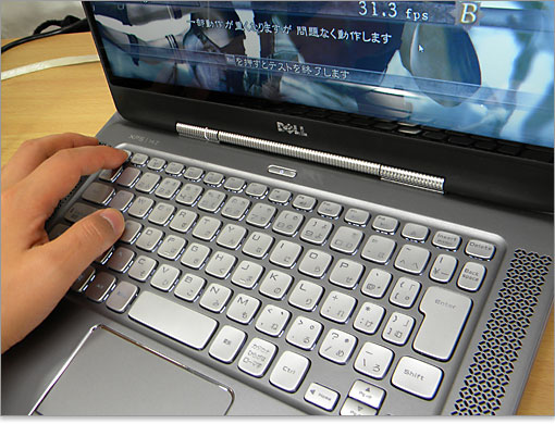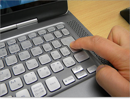 XPS 14z(L412z)のキーでは、押下は割りとソフトタッチ。隣のキーと確実なマージンを取られている「浮石型キー」なので、ちょっとした接触による誤操作が軽減されます。XPS 14z(L412z)にはいくつか小ぶりなキーがありますが、浮石型キーなので指が太いユーザーでも操作は楽です。