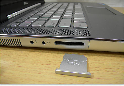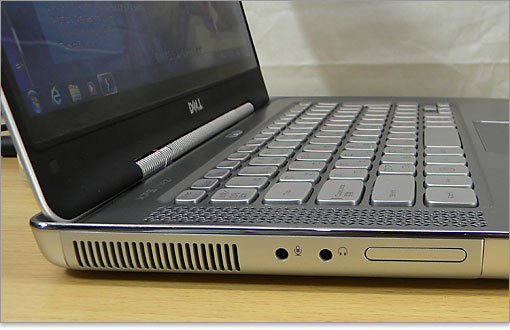 XPS 14z(L412z)左側面に、マイク / ヘッドフォン端子、7-in-1 メディアカードリーダーを装備。