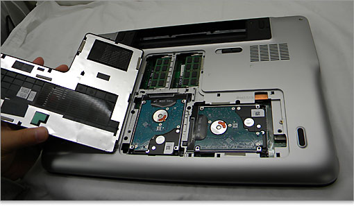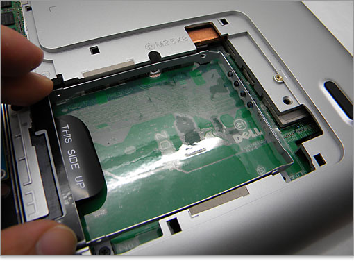 大概のノートはHDDベイが1基ですが、XPS 17(L702X)は17.3インチノートの筐体を生かした2基装備。右側が増設用のHDDベイとなっています。この写真ではすでに増設済みですので、まずは増設前の様子からレポートします。