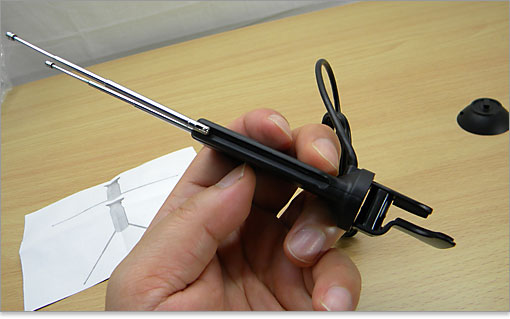 ACアダプタと同じ箱に、室内アンテナが同梱されていました。固定用の吸盤とクリップが付いています。ワンセグチューナーみたいなアンテナですが、一応フルセグ。