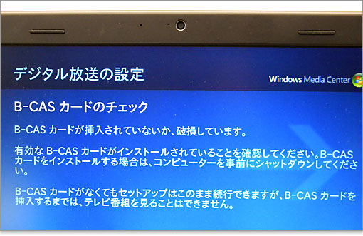 ありゃ、B-CASカードの挿入に手違いが・・。とりあえず、B-CASカードがなくてもセットアップの進行は可能なようです。当然のことながら、B-CASカードが認識されないとテレビは観れません。
