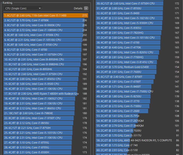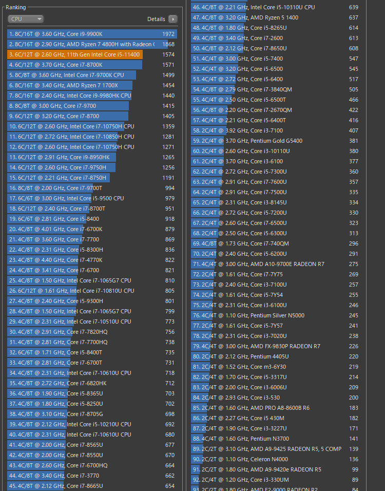 この自作XPS 8900で搭載したCore i5-11400 のパフォーマンスをチェックする。ベンチマークテストはCINEBENCH R15によるレンダリングだが、比較するのはパソ兄さんが過去にレビューしたPCにおけるもの。(重複するCPUでは最高値だったものを残している) 。オレンジ色のバーが今回のCPUのスコアである。なお、CINEBENCH R15の結果がCPU性能の全てではないのでご留意を。