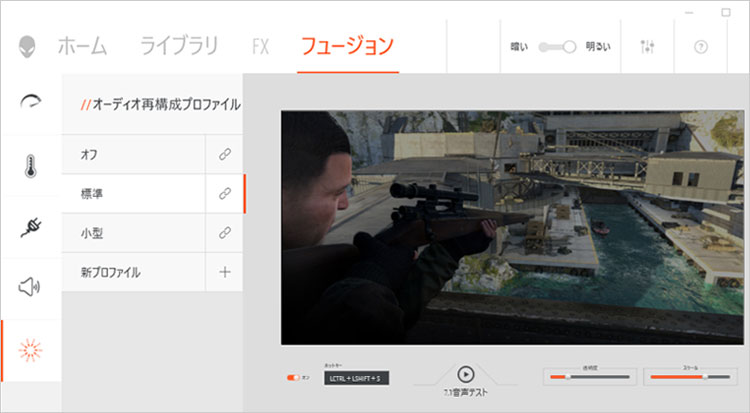 Alienware Command Centerでは「ホーム、ライブラリ、FX、フュージョン」のカテゴリーで分かれている。