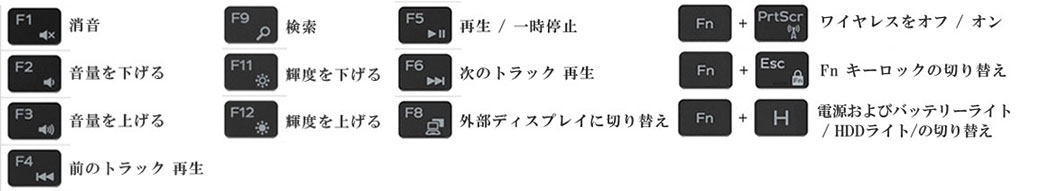 F1~F6キーがメディアコントロールキー、F8が外部ディスプレイ切り替え、F9が検索、F11/12がディスプレイ輝度調整、Fn + PrtScr がワイヤレスのオンオフ。電源&バッテリーライトはHDDアクセスライトと兼用になっており、「Fn + Hキー」を押すごとにその表示内容を切り替えられる。(どっちに切り替わっているのか、動作して確認する必要がある)。このキーボードパーツを搭載している製品すべてに、そのライトを搭載しているのかは不明。各々のモデルで確認されたし。