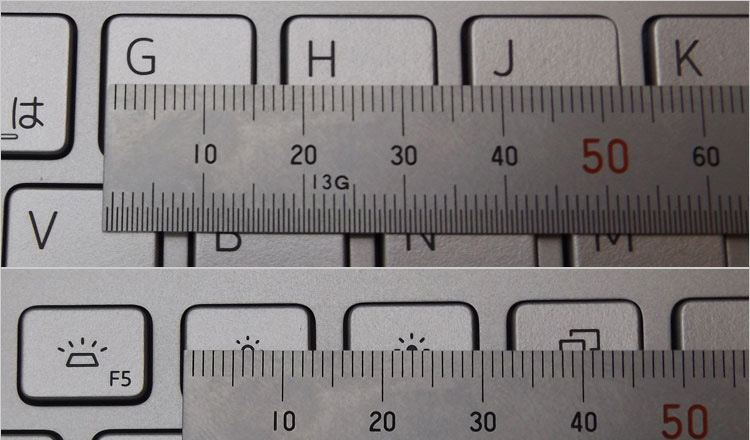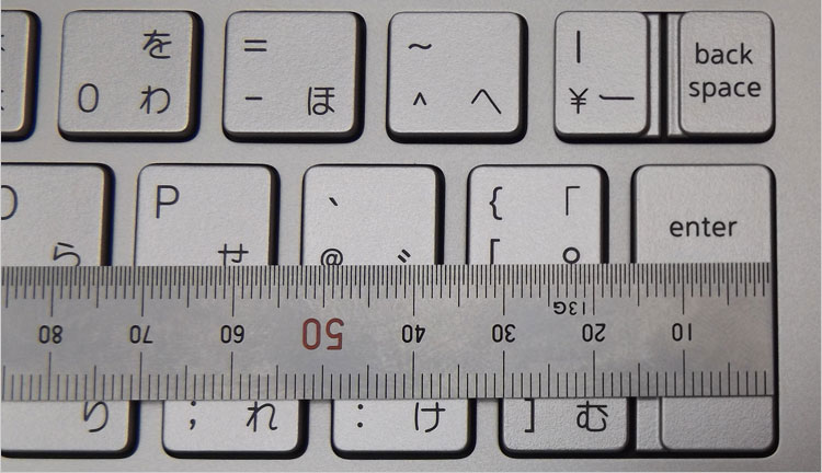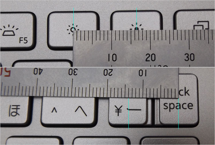 小さいキーでは、ファンクションキーで16.5mmほど。Backspaceキーのところで14mmのキーピッチ。