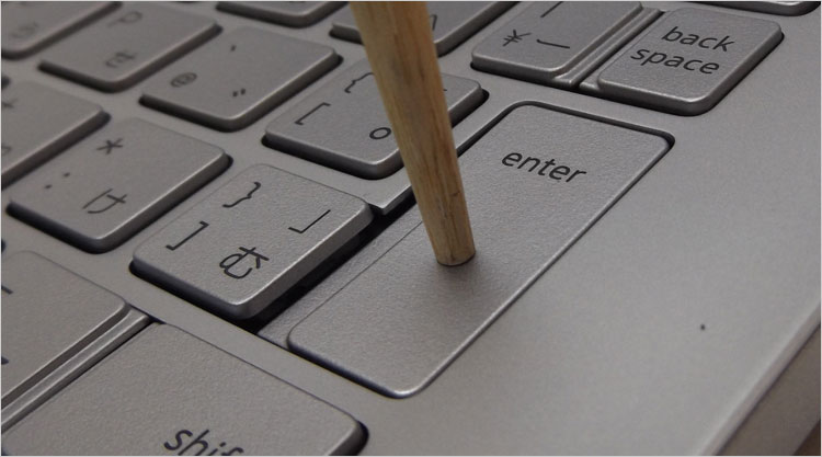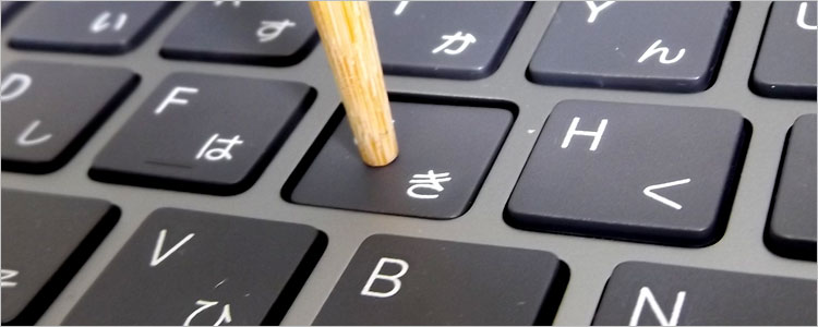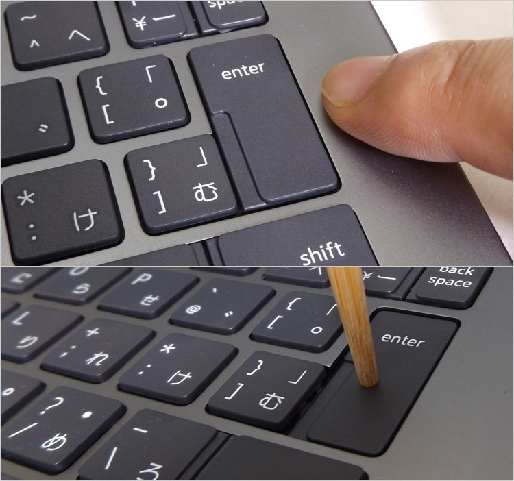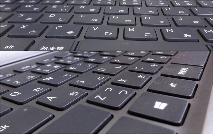 一部のキー(BackSpace、¥、Enter、shiftなど)はその横のキーと隣接させつつ、キートップの段差で隔離している加工がされている。これはユーザービリティのためではなく、単なるコストダウン加工と思われる。プレートの穴開けが英字キーボードと一致していることから、加工をグローバルで共通化させてコストダウンを図っているようだ。 BackSpaceと¥のキーが小さいのでやや扱いづらいのがデメリット。