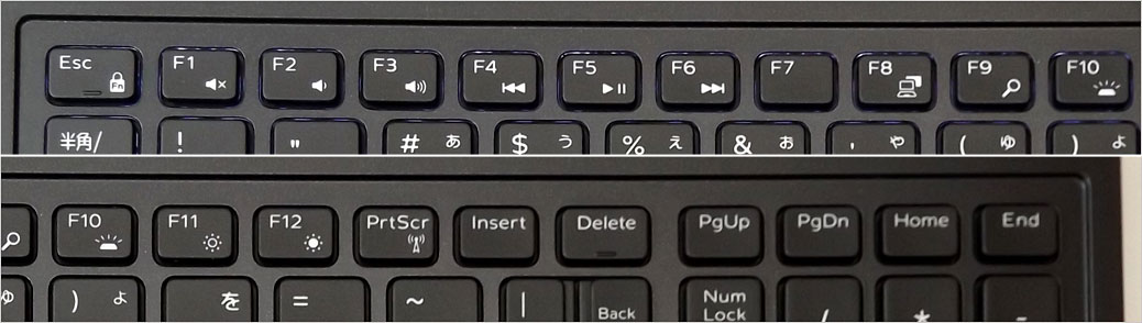 ファンクションキー(F1 ~ F12)と、マルチメディアキー(または設定キー)が兼用になっている。このように2つの機能を兼用するキーのため、優先設定(プライマリ動作)になっていない方は、キーボード左下側にある「Fnキーと同時押し」により使える。なお、「Fn + Escキー」を押すと、その優先キーを切り替えることができる。