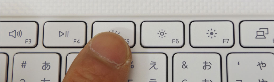 F1~F4までは音量調整や再生/停止といった「メディア・コントロールキー」、F5はバックライト機能のオン・オフと2段階の調光、F6とF7はディスプレイ輝度調整、F8は外部ディスプレイとの切り替え、ほかは印字の通りの兼用となっている。ファンクションキーの数字印字はかなり小さいのでやや見えにくい。