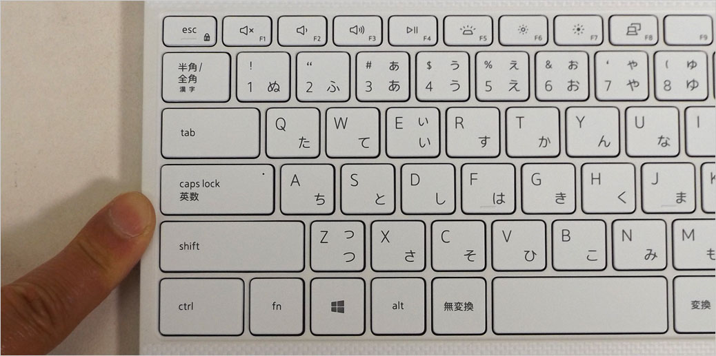 左サイドのキー(半角全角、tab、caps lock、shift、ctrl)がかなり横長で面積広め。とくに使用頻度の高い半角全角キーは押しやすいサイズで良い。以下のアップ写真は、XPS 13-9300で撮影したものとなる。