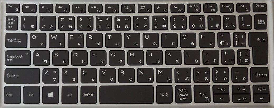 ファンクションキー(F1 ~ F12)と、マルチメディアキー(または設定キー)が兼用になっている。このように2つの機能を兼用するキーのため、優先設定(プライマリ動作)になっていない方は、キーボード左下側にある「Fnキーと同時押し」により使える。なお、「Fn + Escキー」を押すと、その優先キーを切り替えることができる。