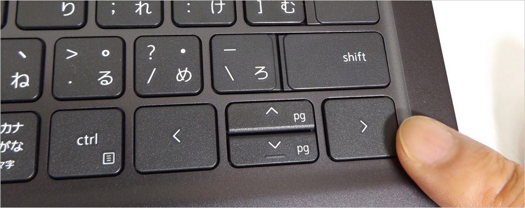 カーソルキーは段差配置になっていないが、右カーソルと左カーソルは大きいので扱いやすい。ただし、上カーソルは縦のリーチが短かく、ほかのキーに囲まれているため扱いにくい。指先を立てて押す必要があるが、キー幅が大きめなので扱いにくさを軽減する工夫はされている。下カーソルは端にあるため上カーソルよりは扱いやすい。