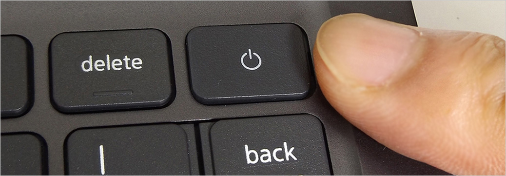 オプションの指紋認識リーダー統合 電源ボタン。特に印字は無く、段差のあるエッジに囲まれているフラットなボタン。指紋を擦る動作があるためか、ボタンの押下はやや固めに設計されている。横に指紋認証リーダーを示すシールが貼られているが、必要なければ剥がせばいい。