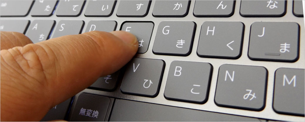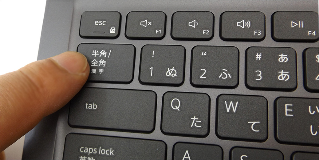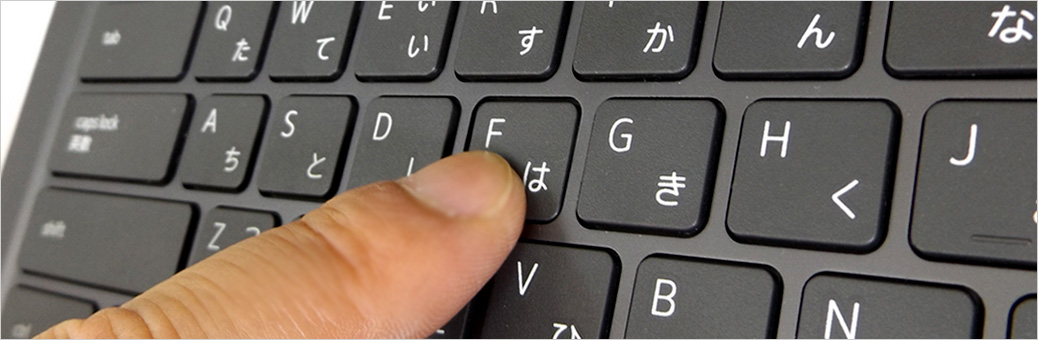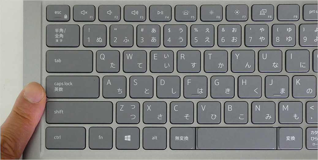 キーボード左側に注目。従来では小さかった半角/全角キーが改善され、かなり大きくなったので扱いやすい。その下に続く、tab、caps lock、shift、ctrlキーは横長で面積広めで押しやすい(むしろ、無駄に大きい)。