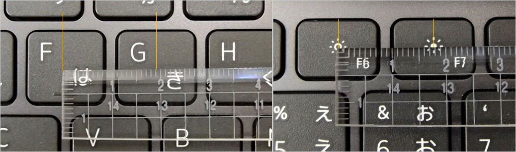 オンライン・マニュアル「セットアップと仕様」によれば、メインキーのキーピッチが19.05 mmとある。定規を置いたところ、公称通りとみてよいだろう。ファンクションキーではやや狭くなるが、18mmはキープしており操作性良好。