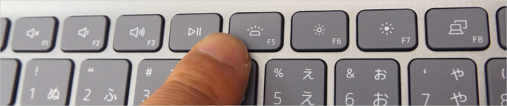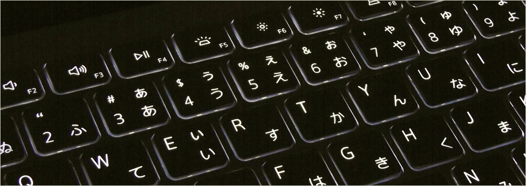 ※キーボード・バックライトでは、F5キーを押すごとに、次のような順で挙動していく。設定キーが優先にされていない場合は、Fn + F5の同時押しで可能。消灯時からスタートして、F5キー押下 1回目でライト機能ON(輝度最大)、2回目で調光(輝度弱)、3回目で消灯時に戻る・・・の繰り返し。なお、点灯時に暫く操作をしていないと自動で消灯するが、どこでもいいのでまたキーに触れると再び点灯する。
