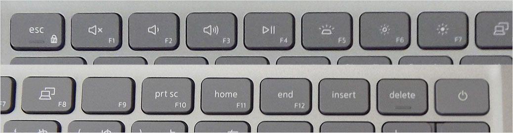 ファンクションキー(F1 ~ F12)と、「マルチメディア・設定キー」が兼用になっている。デフォルトでは印字が大きい方(マルチメディア・設定キー)が優先設定となっているため、優先になっていない方(ファンクションキー)は、キーボード左下側にある「Fnキー」と同時押しにより使える。また、「Fn + Esc」を押すと、その優先キーを切り替えることもできる。※厳密には「優先キーを切り替える」ではなく、Fn + Esc(南京錠マーク)を押してマルチメディア機能を無効にするという動作。ただ、優先キーを切り替えるという意識のほうが扱いやすい。BIOSのセットアップでファンクションキーの動作を変更することも可能。