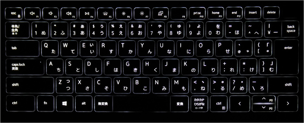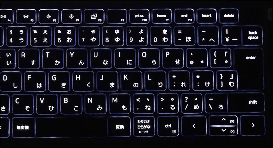 F1~F4までは音量調整や再生/停止といった「メディア・コントロールキー」、F5はバックライト機能のオン・オフと2段階の調光、F6とF7はディスプレイ輝度調整、F8は外部ディスプレイとの切り替え、ほかは印字の通りの兼用となっている。ファンクションキーの数字印字はかなり小さいのでやや見えにくい。