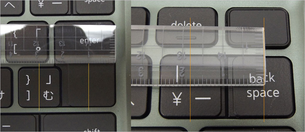 Enterキーと隣接する「む」では、キーピッチ約19mmあるのでフルサイズをキープしている。従来よりも大きくなった「BackSpace」と¥のキーピッチは約18mmほどあり、少しゆとりができた。フルサイズの19mmには達しないが18mmあれば十分だろう。