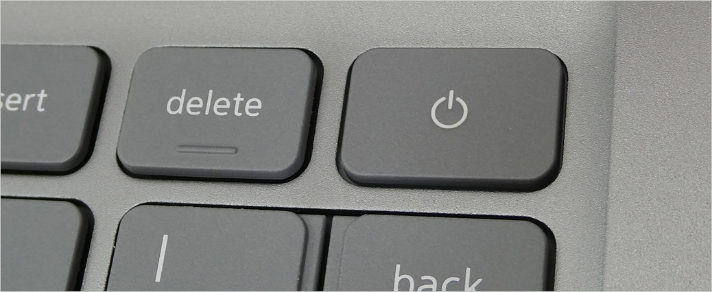 14インチノート、Inspiron 14(5410)での搭載例。タイタン・グレーと呼ばれるグレー色のキーボード。ノーマルの電源ボタンを搭載。オプション扱いのバックライト・キーボード機能あり(F5にマークあり)。