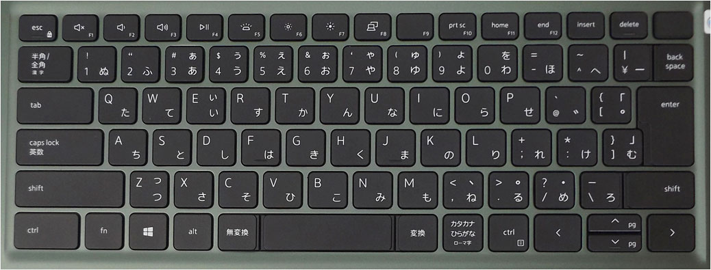 13.3インチノート、Vostro 5310で搭載されていた例。「カーボン」と呼称されている、やや浅めブラック色のキーボード。ノーマルの電源ボタン、バックライト機能なし(F5が無地)の状況。13型ノートだとかなりギリギリまでの幅となるので、12型以下のノートで見ることはないだろう。