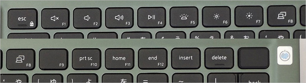 ファンクションキー列。オプションでバックライト・キーボード機能が追加されているので、F5に「バックライト」のマークが印字されている。ファンクションキー列については上記のサンプル 同型 ブラック(オプション機能 : バックライト / 指紋認証リーダー統合)と同じ内容となる。